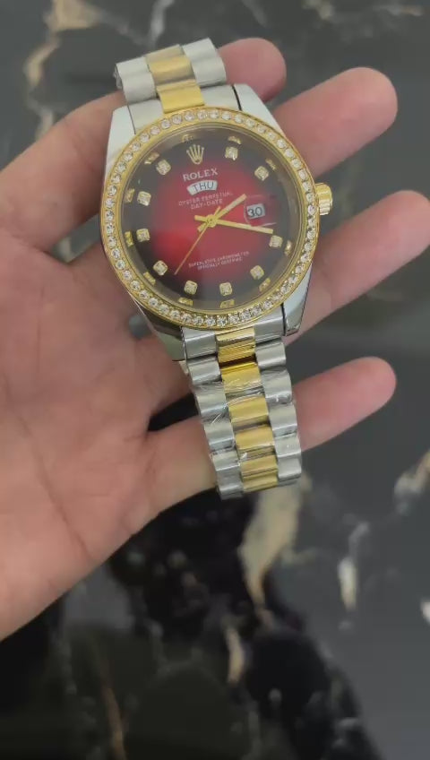Rol ex Red Dial Metal Belt Analog Quartz Movement Case Date Gift Men's Watch